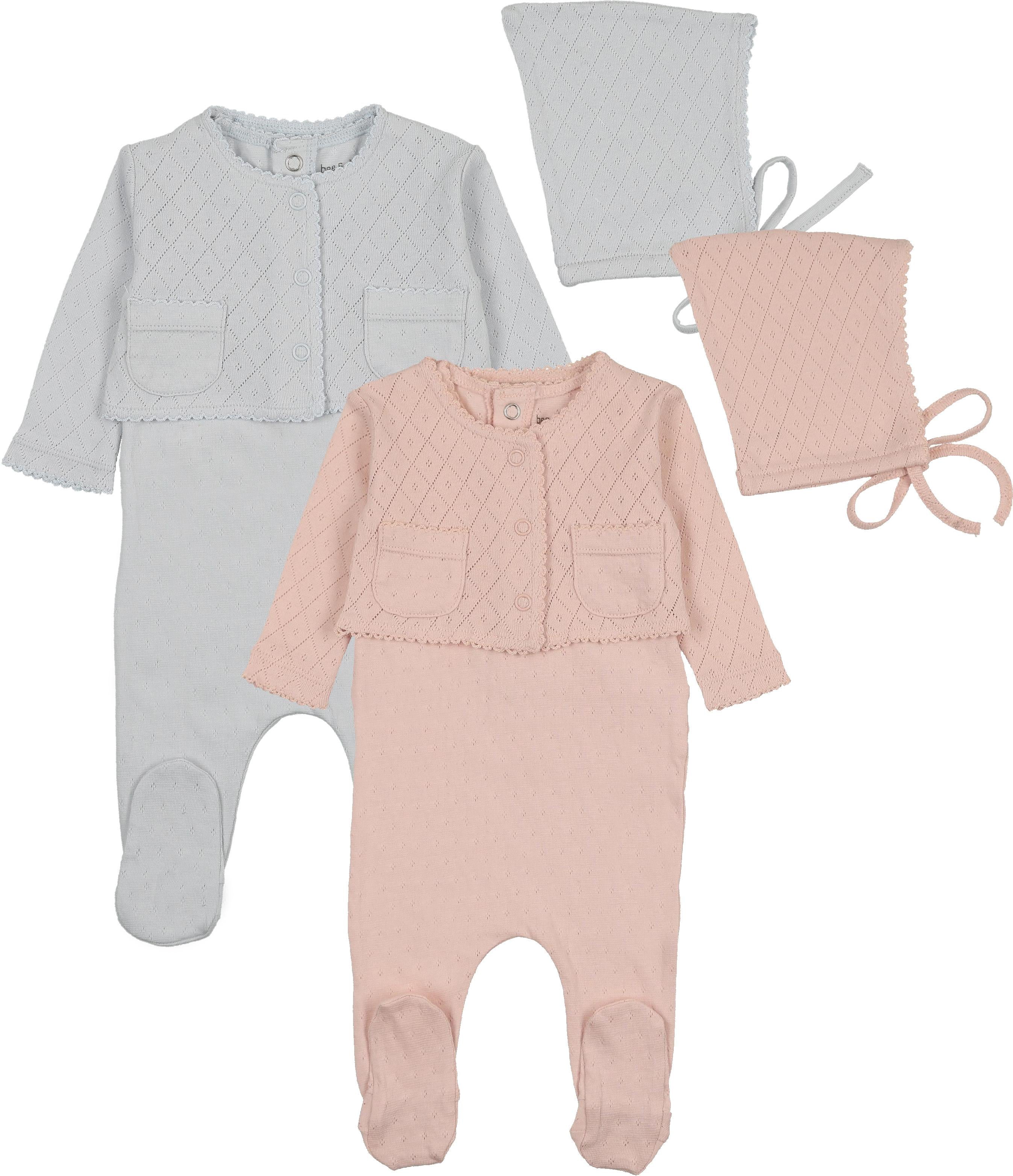 Bee & Dee Baby Boys Girls Double Diamond Cotton Footie, Cardigan & Bonnet Set - KDDO - Champagne Pink / 1 Month is backordered and will ship as soon as it is back in stock.